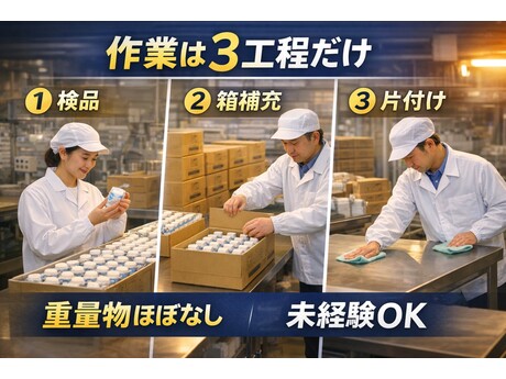 18:00開始の固定シフトで、冷凍ホイップ製品の出荷工程を支える軽作業です。検品・資材補充・作業終了後の整理整頓など、担当工程が明確に分かれており、未経験でも習得目安は約1~2週間。本業後でも体力負担が少なく、収入計算がしやすい勤務形態です。
