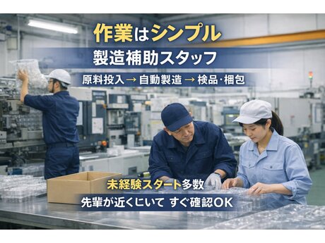 プラスチック製品の製造補助業務です。作業は機械操作が中心で、原料投入・検品・梱包などのシンプル工程からスタート。三交代制ですが勤務時間は固定で、年間カレンダーにより先の予定も立てやすい環境です。未経験者が多数活躍しており、長期勤務を前提とした安定稼働の職場です。