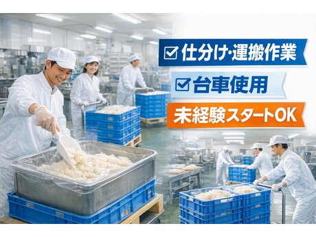 おにぎり製造工場での工場軽作業スタッフ募集。炊きあがったご飯の移動や配送先ごとの仕分け・運搬を担当。勤務は14時~23時の固定シフト、週4日~勤務可能。未経験でも研修で作業手順を習得できるため安心してスタート可能。台車を使用した運搬作業中心で、安定して働ける環境です。